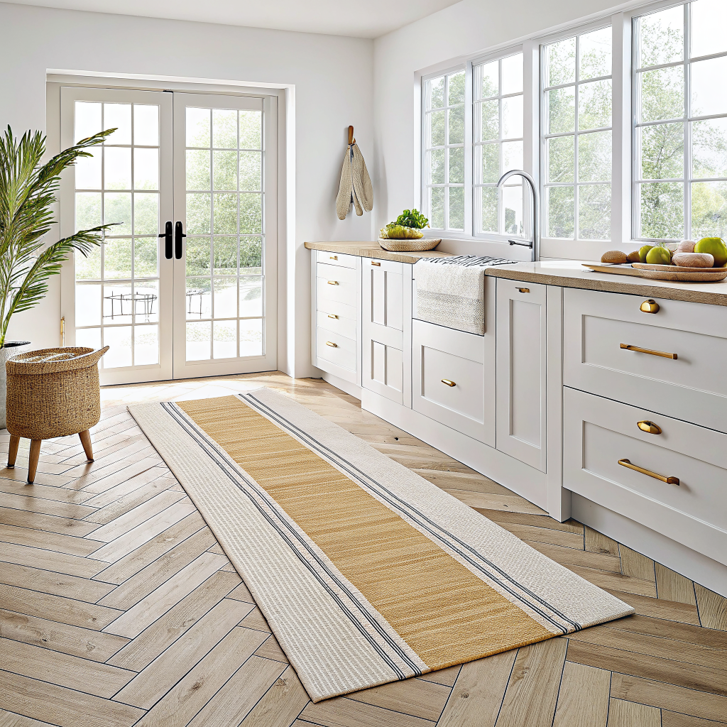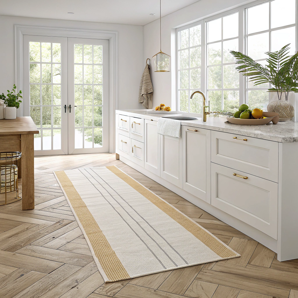 Mutfağınız evin kalbidir ve bu kalp, en şık dokunuşu hak eder. Görseldeki zarif tasarımıyla dikkat çeken Modern Çizgili Mutfak Yolluğu, mutfak tezgahınızın önünde hem konforlu bir alan yaratır hem de mekanın havasını anında değiştirir.